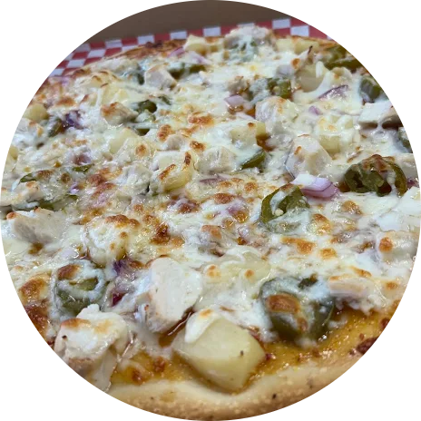 Mango habanero sauce, topped with fresh diced mozzarella cheese, crisp red onions, spicy jalapenos, juicy pineapple, and juicy Chicken